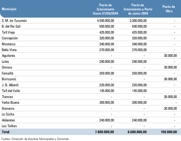 Montos otorgados clasificados por municipalidad según pacto de crecimiento, pactos de obras -Tucumán | 01/01/2004 - 31/08/2004.