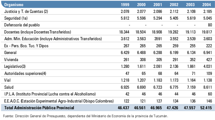 Agentes de la administración pública, según organismo y por año. Tucumán | 1999 - 2004.