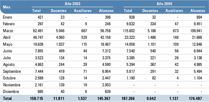 Docentes, auxiliares y alumnos afiliados al subsidio de salud por mes y año. Tucumán | 2003 - 2005